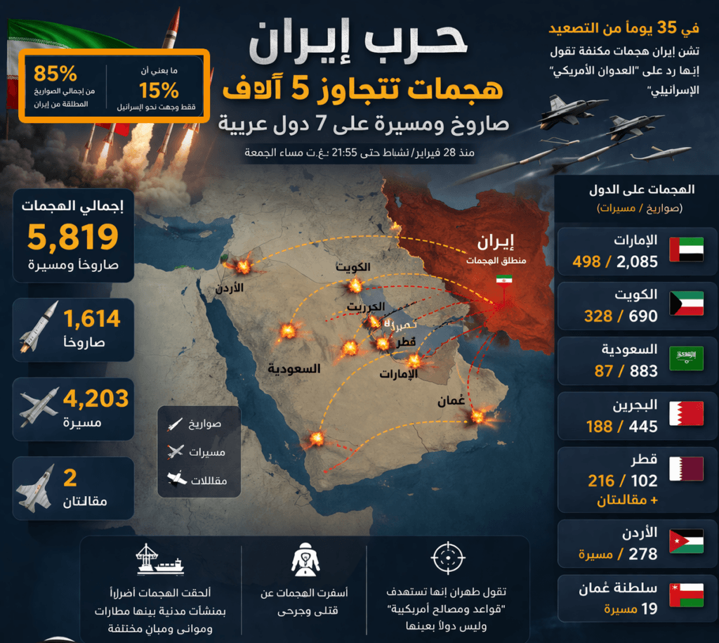 في تصعيد غير مسبوق، كشفت الاحصاءات التي أعدها وكالة أنباء هولندا أن إيران نفذت هجمات مكثفة استهدفت سبع دول عربية، معظمها في منطقة الخليج، مستخدمة ما لا يقل عن 5819 صاروخاً وطائرة مسيّرة، إضافة إلى هجوم بمقاتلتين، وذلك خلال 35 يوماً من العمليات التي تقول طهران إنها تأتي رداً على “العدوان الأمريكي الإسرائيلي”.