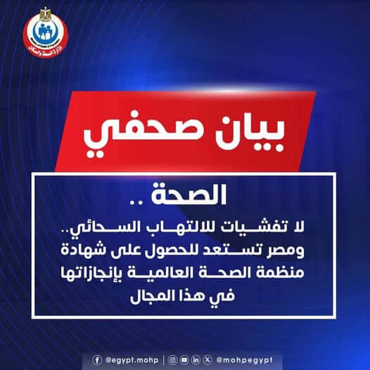 وتؤكد وزارة الصحة والسكان، أنه لا توجد أي تفشيات للالتهاب السحائي في مصر حاليًا، وأن الحالات المسجلة هي حالات فردية متفرقة تقع ضمن المعدلات الطبيعية السنوية المتوقعة، مشددة على أن مصر تستعد خلال المرحلة المقبلة للحصول على شهادة رسمية من منظمة الصحة العالمية تقديرًا لانجازاتها في هذا المجال ، تماشيًا مع خارطة الطريق العالمية للقضاء على وبائيات الالتهاب السحائي بحلول عام 2030.
