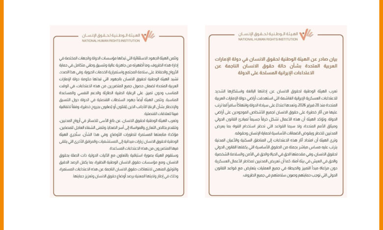الهيئة الوطنية لحقوق الانسان في دولة الإمارات تصدر بياناً بشأن حالة حقوق الانسان الناجمة عن الاعتداءات الإيرانية المسلحة