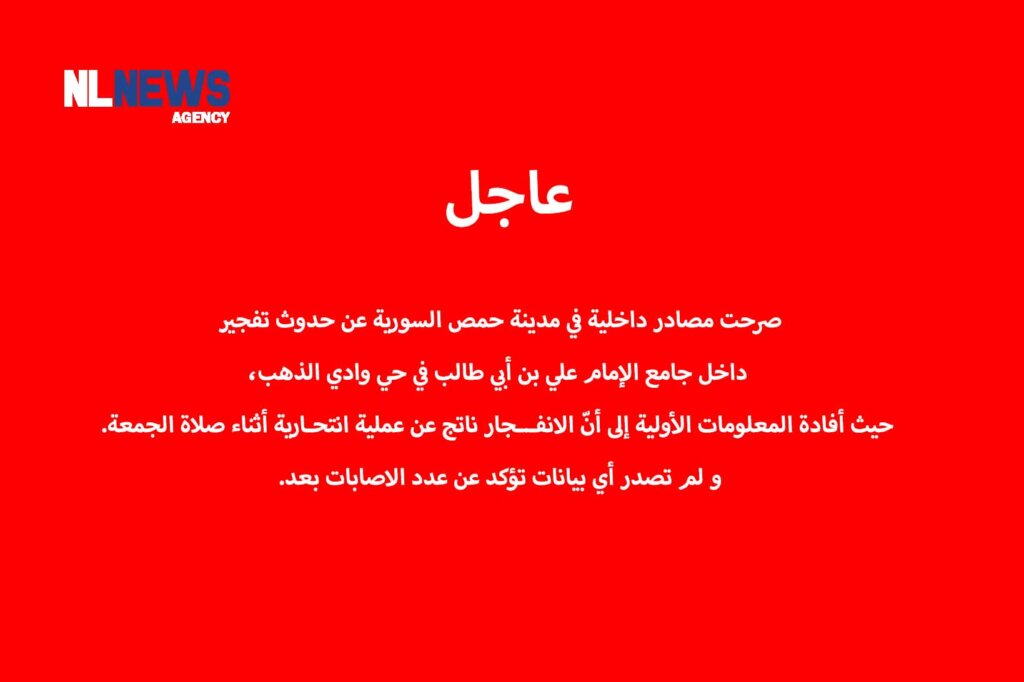 صرحت مصادر داخلية في مدينة حمص السورية عن حدوث تفجير داخل جامع الإمام علي بن أبي طالب في حي وادي الذهب، حيث أفادة المعلومات الأولية إلى أنّ الانفـ.ـجار ناتج عن عملية انتحـارية أثناء صلاة الجمعة.