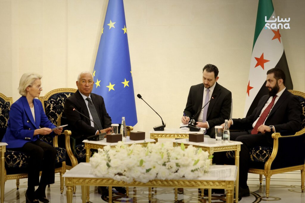 إلتقى رئيس المجلس الأوروبي أنطونيو كوستا ورئيسة المفوضية الأوروبية أورسولا فون دير لاين رئيس المرحلة الانتقالية في سوريا أحمد الشرع في قصر الشعب بدمشق، بحضور وزير الخارجية والمغتربين أسعد حسن الشيباني، وذلك في إطار زيارة رسمية بحثت آفاق العلاقات الثنائية.