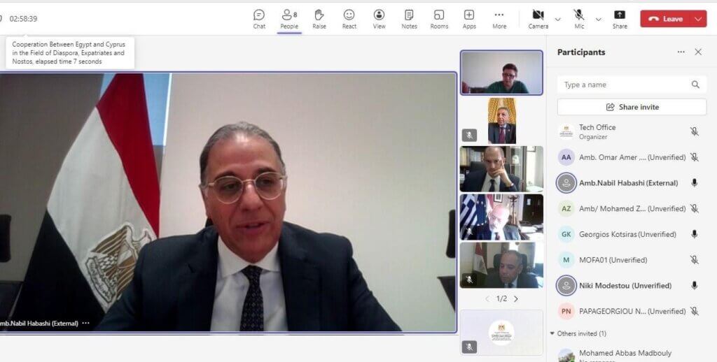 التقى السفير نبيل حبشي نائب وزير الخارجية للهجرة وشئون المصريين بالخارج، عبر الفيديوكونفرانس، مع السيد جورجيوس كوتسيراس نائب وزير الخارجية اليوناني، والسفيرة ثيودورا كونستانتنيدو رئيس خدمة القبارصة في الخارج والعائدين للوطن، بحضور سفيري مصر باليونان وقبرص والسفير اليوناني بالقاهرة؛ لبحث التعاون المشترك فى مجال المغتربين، وعلى نحو يشمل المبادرة الرئاسية “احياء الجذور – NOSTOS”.
