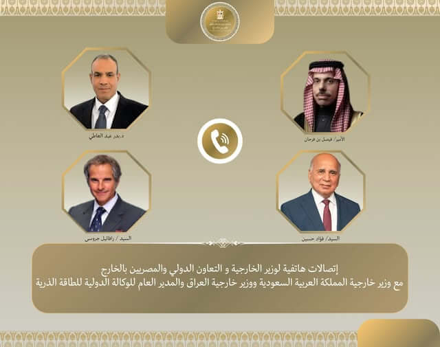 أجرى بدر عبد العاطي، وزير الخارجية والهجرة وشؤون المصريين بالخارج، سلسلة اتصالات هاتفية، يوم الاثنين 13 أبريل، مع كل من فيصل بن فرحان وزير خارجية المملكة العربية السعودية، وفؤاد حسين نائب رئيس مجلس الوزراء ووزير خارجية العراق، إلى جانب رافائيل جروسي المدير العام للوكالة الدولية للطاقة الذرية، وذلك في إطار التنسيق والتشاور بشأن مستجدات الأوضاع الإقليمية.
