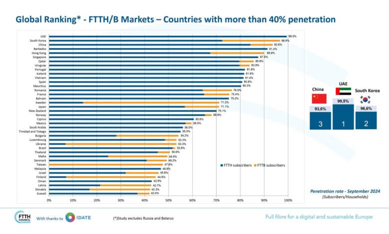 حقَّقَت دولة الإمارات رقمًا قياسيًّا جديدًا في نسبة شبكات الألياف الضوئية الموصولة إلى المنازل، بلغ 99.5%، لتحتفظ بذلك بالمركز الأول عالميًّا منذ عام 2016، وذلك بحسب التقرير السنوي الذي أصدره المجلس الأوروبي للألياف الضوئية الموصولة للمنازل، عن بيانات عام 2024.