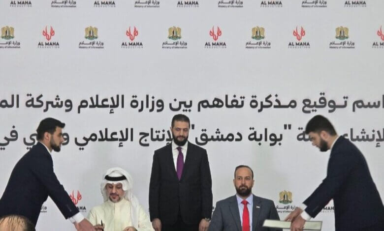 بحضور الرئيس السوري أحمد الشرع، جرت اليوم في قصر الشعب بالعاصمة دمشق مراسم توقيع مذكرة تفاهم بين وزارة الإعلام السورية وشركة “المها الدولية”، لإطلاق مشروع “بوابة دمشق”، الذي يُعد أول مدينة متكاملة للإنتاج الإعلامي والفني والسياحي في سوريا، بتكلفة تقديرية تتجاوز 1.5 مليار دولار أمريكي.