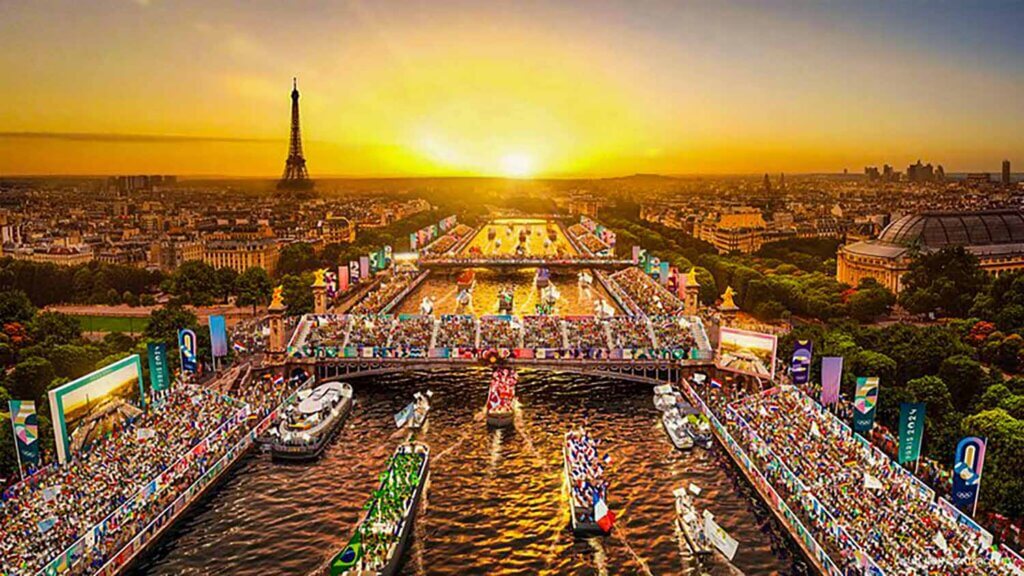 بعرض وصف بأنه مذهل والأروع على نهر السين شارك فيه ما ينوف عن 6,800 رياضي من 205 دولة يستعرضون في 94 قارب لمسافة 6 كم أمام معالم تاريخية في العاصمة الفرنسية من جسر أوستيرليتز إلى جسر يينا، وللمرّة الأولى في التاريخ، أقيم حفل الافتتاح خارج الملعب الرئيسي، وشاهده 320,000 شخص، وحضور 120 من قادة العالم.