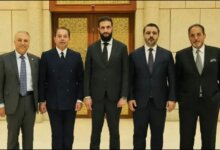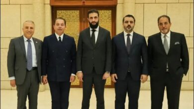 - موفق القداح وانس الكزبري وغسان عبود خلال لقاءهم مع الرئيس أحمد الشرع ووزير الخارجية أسعد الشيباني